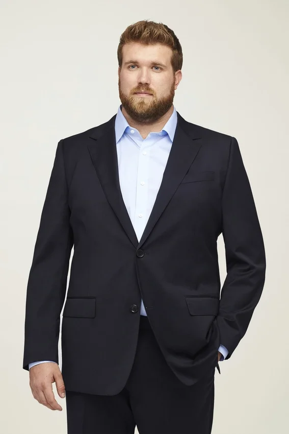 Model is 6’6″ with a 50″ Chest, and is Wearing a 50L Suit Jacket.