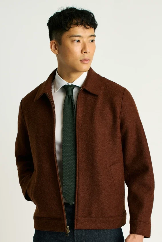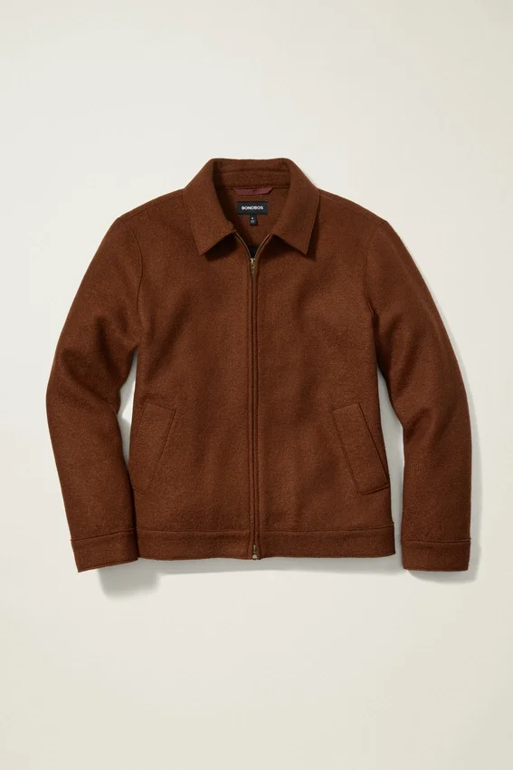 Stay Warm and Cozy in the Deck Jacket with Boiled Wool from Bonobos. Italian Craftsmanship Meets Rugged Style for the Perfect Mix of Comfort and Durability.