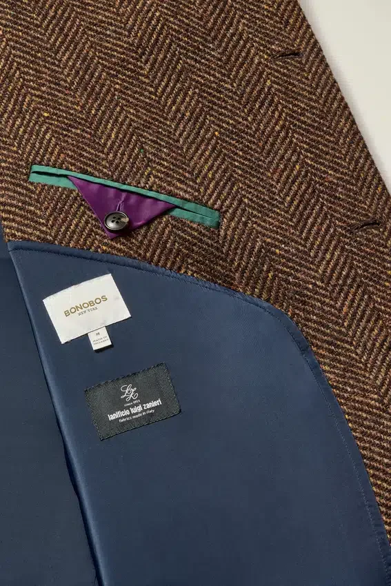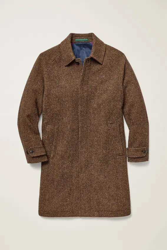 Italian-Milled Wool | Herringbone Tweed Pattern & Texture | Front Button Closure | Raglan Sleeves | Welt Pockets | Sleeve Cuff Tabs | Vented | Fully Lined Interior | Interior Pockets