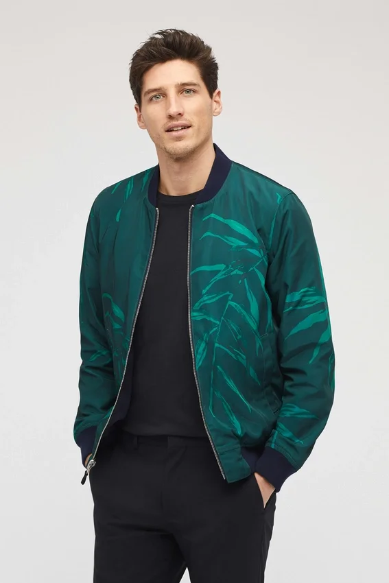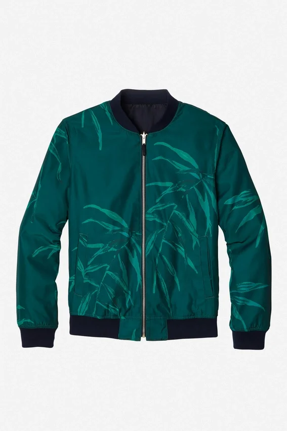 Fully Reversible Printed Bomber. Solid Navy on Interior. Rib Collar and Hem. Single Welt Hand Pockets.