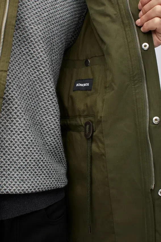 Water Resistant Fabric | Hood with Drawcord | Center Front Zip & Hidden Snaps at Placket | Exterior Welt Chest Pocket with Zipper Closure | Interior Drawcord at Waist | Exterior Flap Hand Pockets with Hidden Snap | Hidden Snap at Sleeve Cuff | Lined Front | Interior Welt Pockets | This Field Jacket is Designed for a Slightly Looser Fit Adjustable at the Waist. Take Your Normal Size. For a Slimmer Fit, Size Down