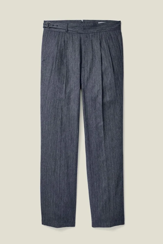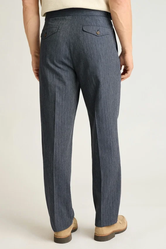 Cummerbund-Style Waist | Single Side-Tab Buckle for Customizable Wear | Back Flap Pockets | Double-Pleated Front | Slightly Higher Rise