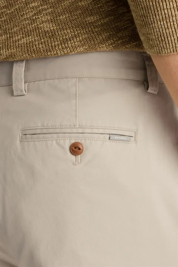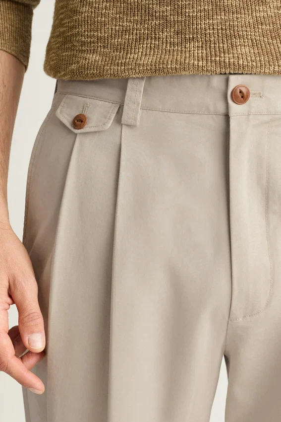 Original Chino Fabric with an Added Stone Wash | Double Pleats | Coin Pocket with Flap | Kissing Welt Back Pockets with Button Closure