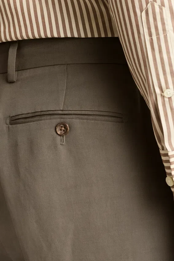 Fabric from Duemilagori Mill in Italy | Hook and Bar Closure with Extended Tab | Button-Through Back Pockets | Front Leg Lining