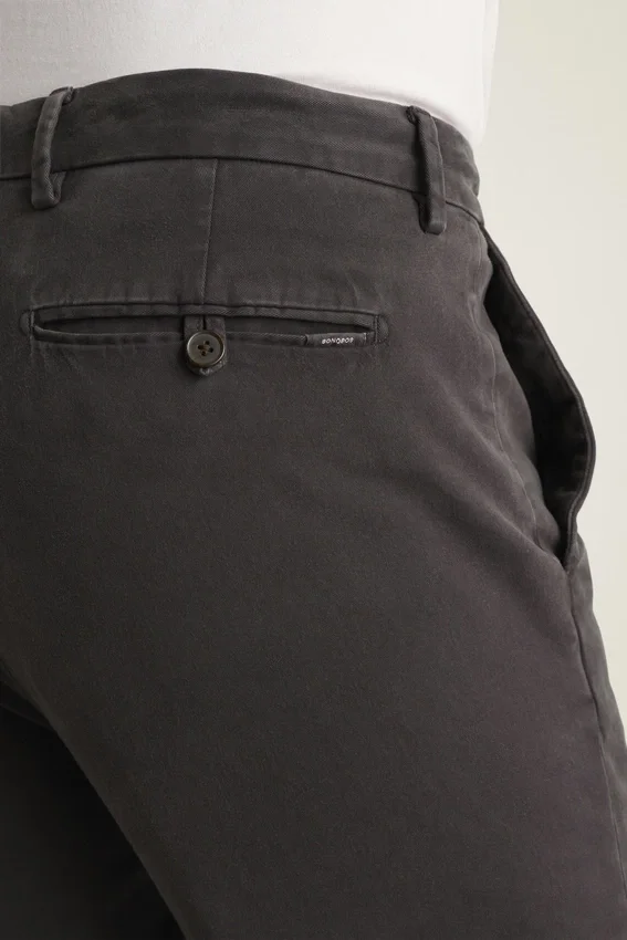 Garment-Dyed for Softness | Luxe Fabric | Year-Round Weight | Signature Contour Waistband with Interior Waistband Curtain | Front Closure Has Extend Tab with Button | Welt Back Pockets with Buttons