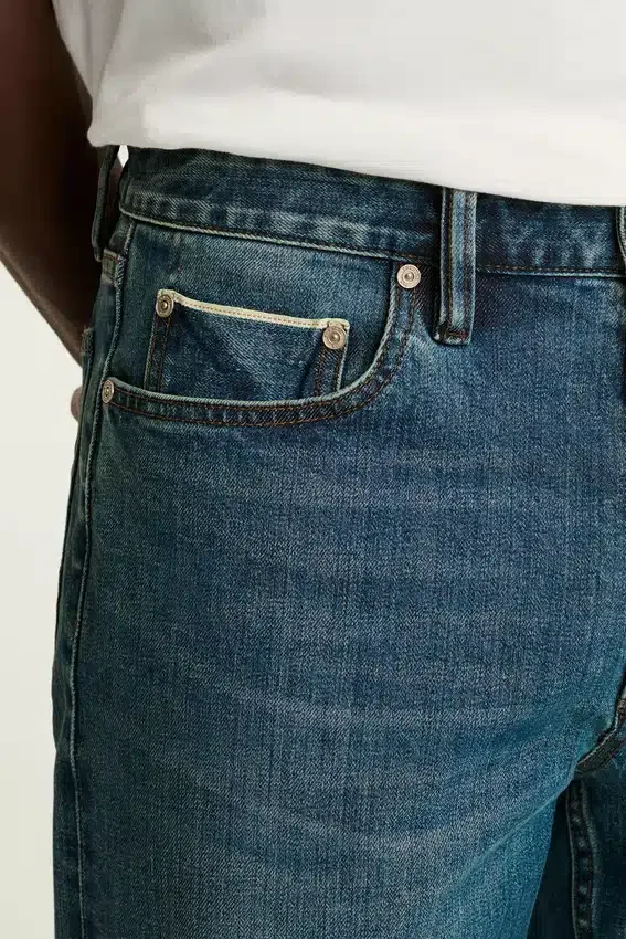 Branded Shank and Rivets | Recycled Pocket Bags | Apple Peel Faux-Leather Back Patch | Selvedge Edging on Coin Pocket and Interior Fly