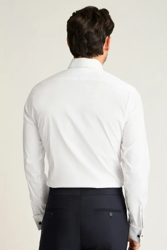 Our Finest Tuxedo Shirt Crafted with Mother-Of-Pearl Buttons and Split-Back Yoke! Designed with 78% Italian Cotton, 18% Polyamide, & 4% Elastane for Comfort and Durability!