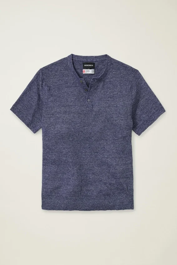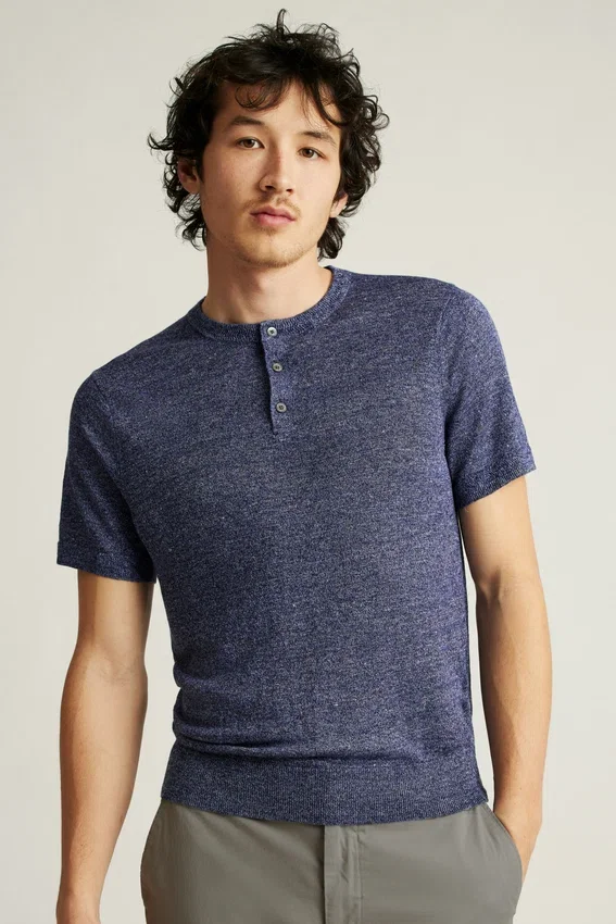 100% Linen | Three-Button Placket | Two-Color Marled Yarn | Lightweight Jersey Stitch | Zigzag Stitch Detail at Neck