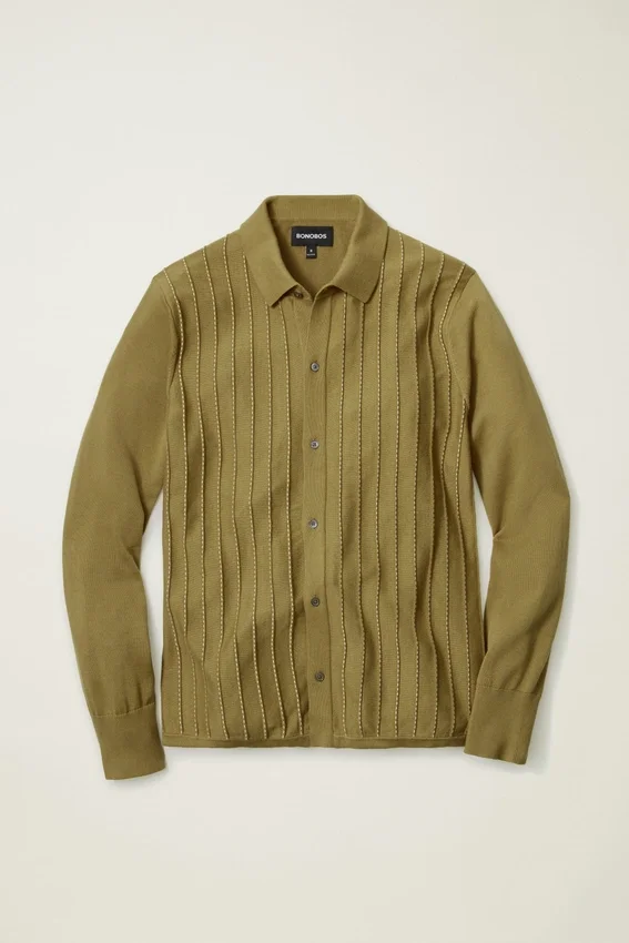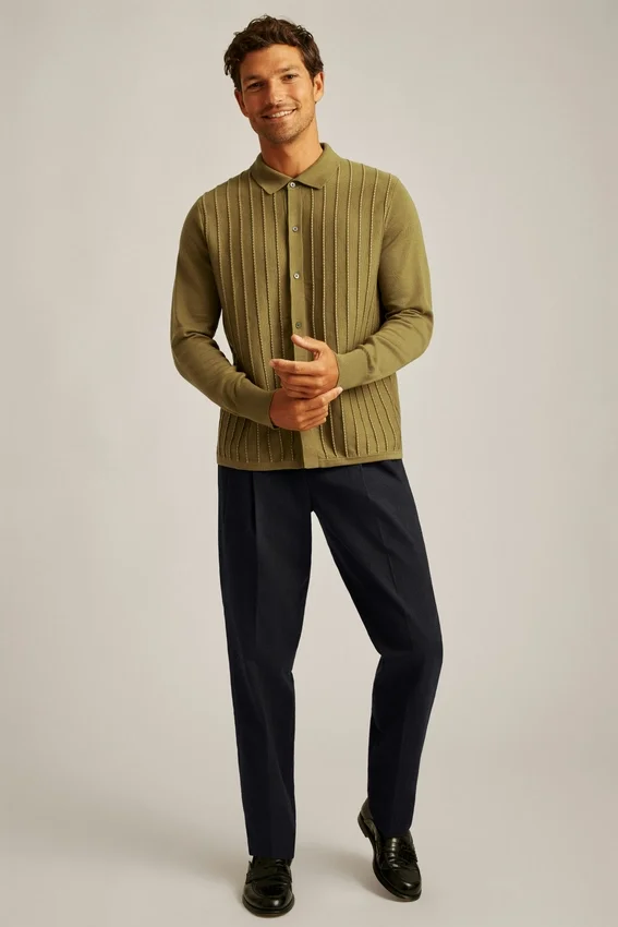 Soft and Breathable Cotton Yarn with Dimensional Vertical Stripes at Front Body for Sophisticated Retro Vibes | Jersey Back Body and Sleeves | Full Placket