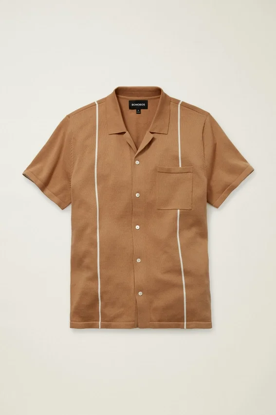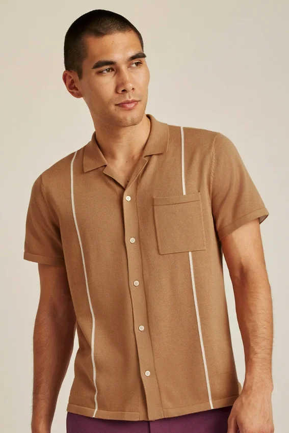 Soft and Breathable Cotton Yarn in Full-Placket Silhouette with Vertical Stripes and Left Chest Pocket for Fashion-Forward and Retro Vibes.