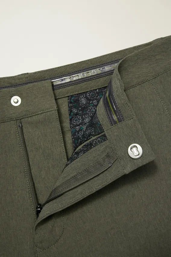 Stretch Waistband | Shirt-Gripping Elastic at Interior Waistband | Slide Snap Closure | Secure Zip Back Pocket | Added Gusset for Comfort & Movement | Wicking | Upf