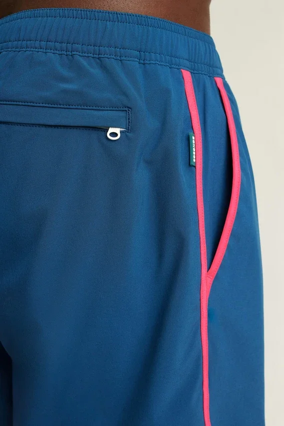 Vintage Surf-Inspired Curved Split Hem with Self-Binding and Placed Embroidery | Elastic Waistband with Interior Drawcord | Mesh Interior Lining | Front Pockets with Binding | Back Pocket with Zipper | Contrast at Interior Waistband and Key Catch