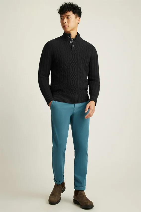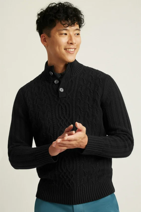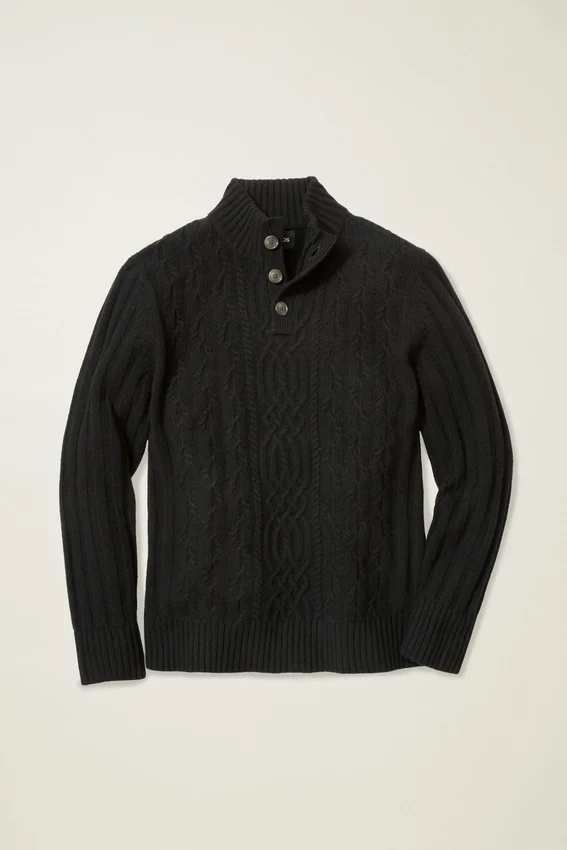 Our Cable Popover Sweater for Men in Mid-Grey or Eggnog is the Perfect Winter Addition to Your Wardrobe and Offers a Sophisticated Look for Any Occasion.