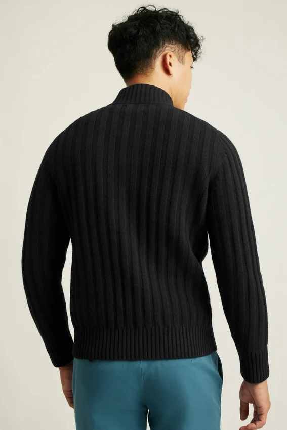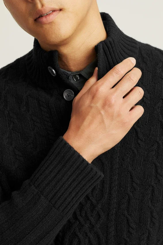 Cozy Wool Blend Yarn in a Funnel Neck Cardigan with Allover Cable Stitch | Button Closure | Rib Trims