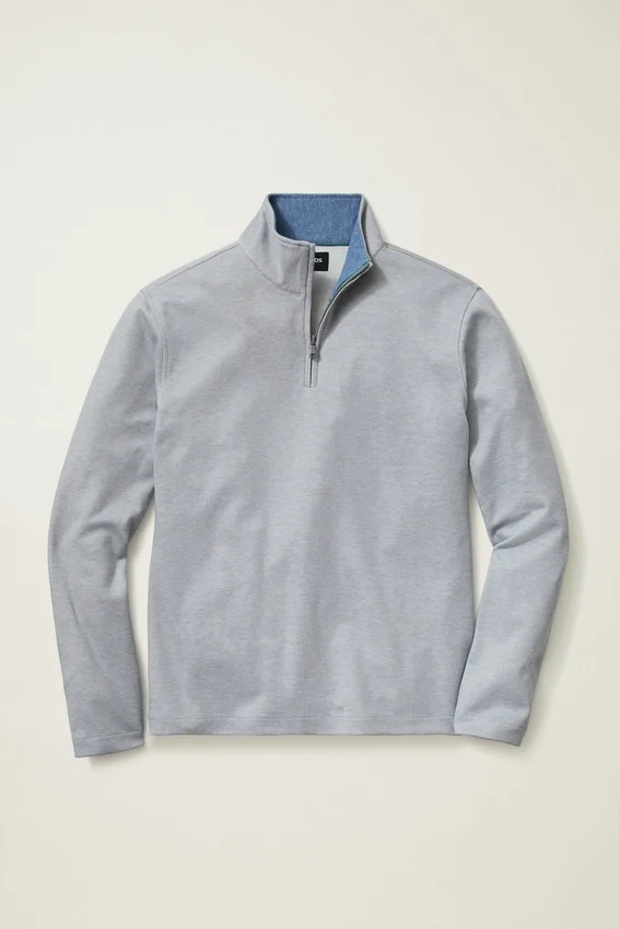 Soft Double Face Fabric. Contrast Color at Interior Neck. Zipper Closure at Neck. Wicking.