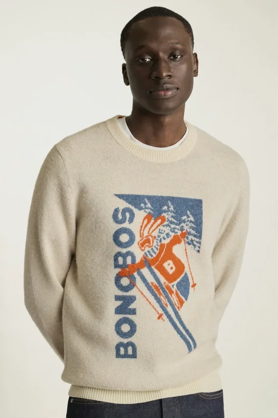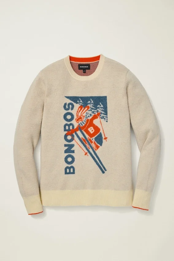 Get Cozy in Our Extrafine Merino Ski Bunny Sweater, Inspired by Retro Posters. Perfect for Apres Ski Style, Even if You’re Not Hitting the Slopes.