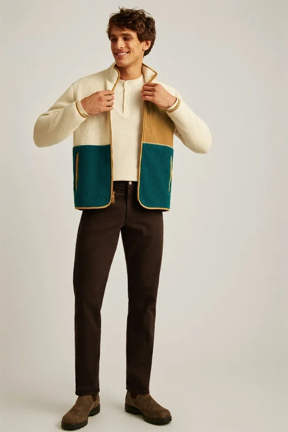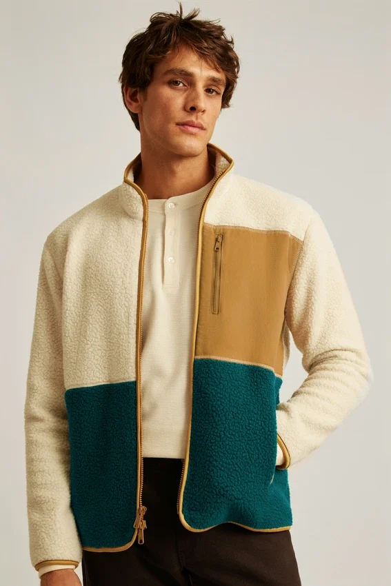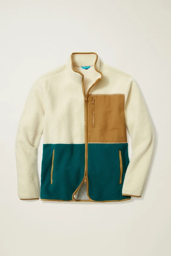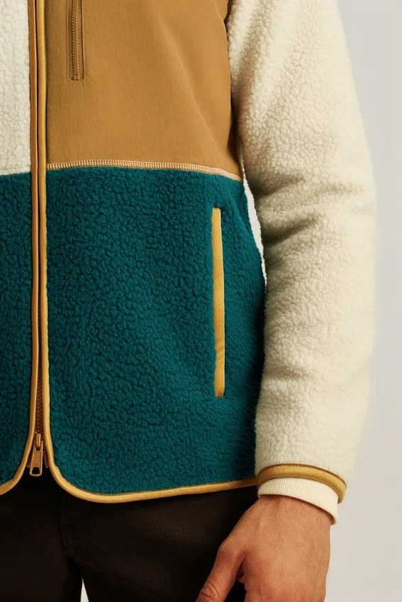 Warm and Cozy High-Pile Fleece with Color Blocking. Zipper Closure, Fully Lined. Contrast Color Nylon Chest Pocket with Zipper Closure. Welt Hip Pockets with Zipper Closure.
