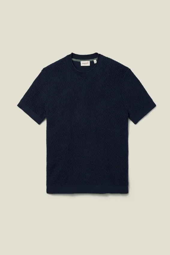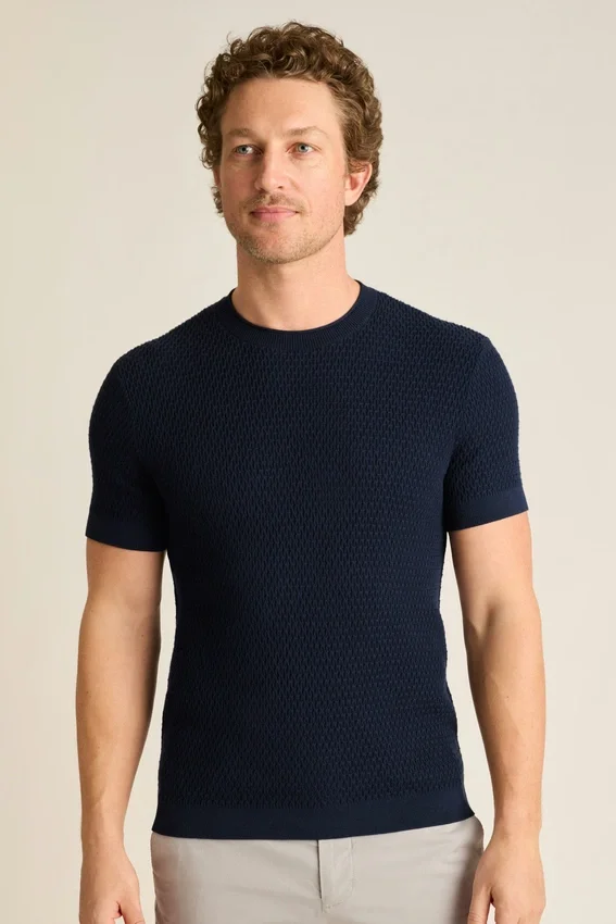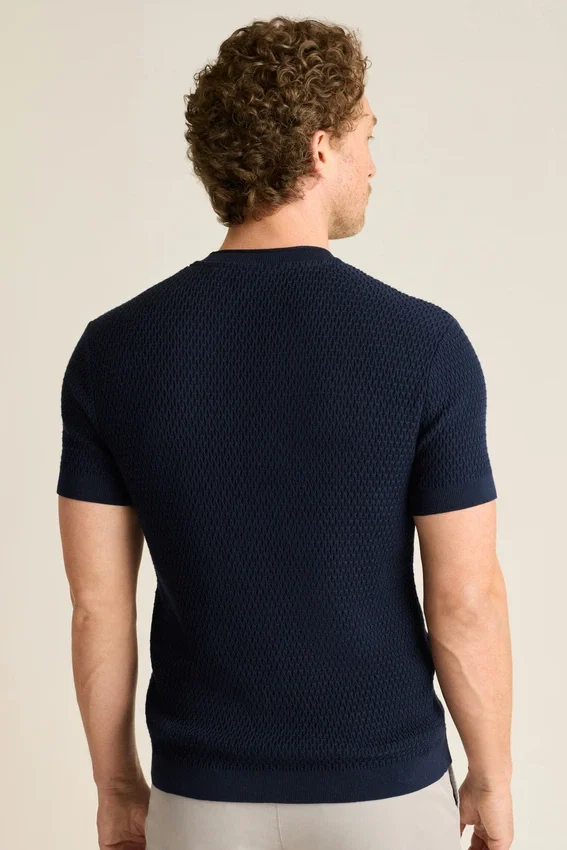 Soft and Breathable Cotton Yarn | Allover Texture Stitch | Crew Neck with Rolled Edge | Rib Trims | Short Sleeves | Lightweight