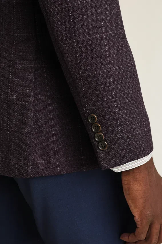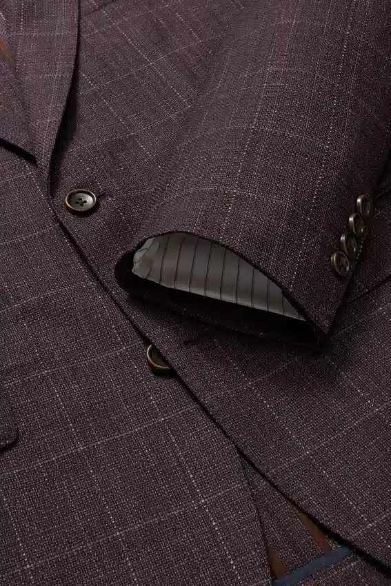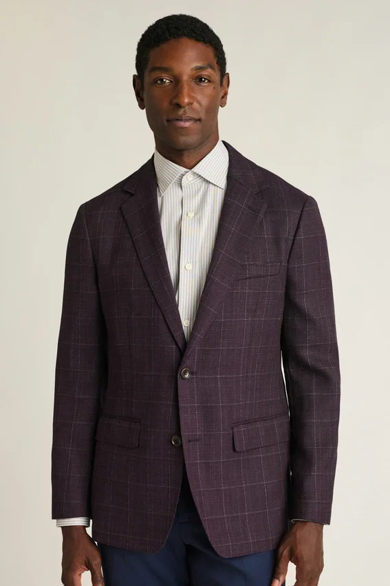 Jacket Features Modern 2-½” Lapels | Double-Button, Double-Vented with Contrast Piping and Non-Functioning Button Cuffs | Lined Only at Sleeves