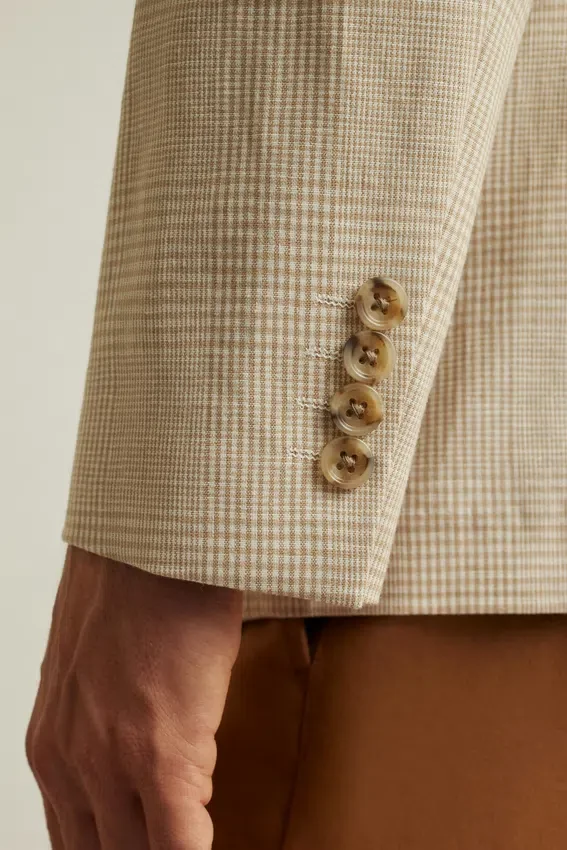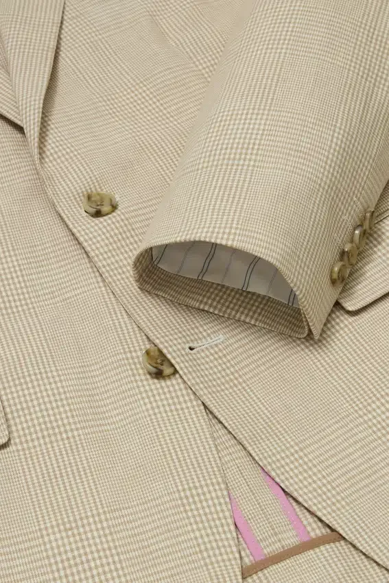 Jacket Features Modern 2-½” Lapels | Double-Button, Double-Vented with Contrast Piping and Non-Functioning Button Cuffs | Lined Only at Sleeves