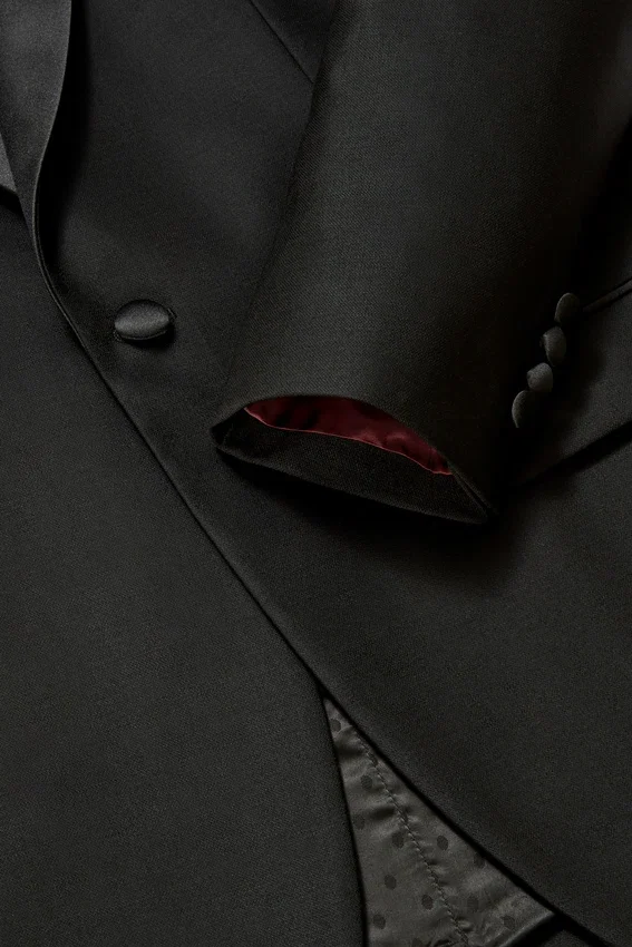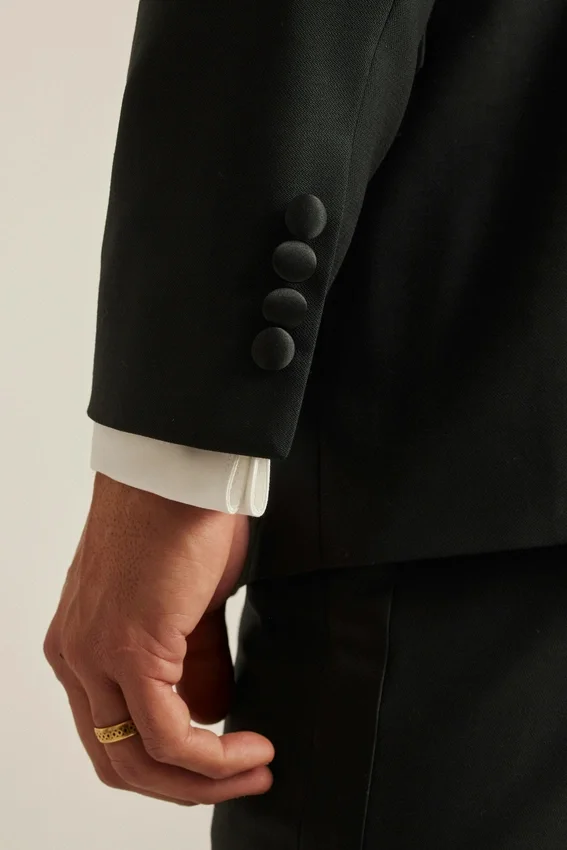 This Fully Lined Tux is Made in a Barethea Stretch Wool from Marzotto.| Contrast Satin Peak Lapel | Single Satin-Covered Button at Front | Flap Pockets | Fully Lined Interior with Jacquard Dot | Bemberg Sleeve Lining, Interior Pockets and Contrast Interior Piping | Back Vents