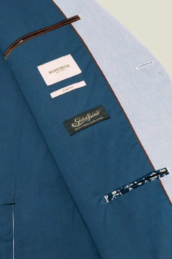 Fabric from Subalpino | Half Canvassed Construction |Notch Lapel | 2 Buttons at Front | Double Vent | Non-Functioning Button Cuffs for Easy Sleeve Tailoring | Fully Lined Interior | Custom Bonobos Flower Embroidery at Interior | Custom Bonobos Print at Interior