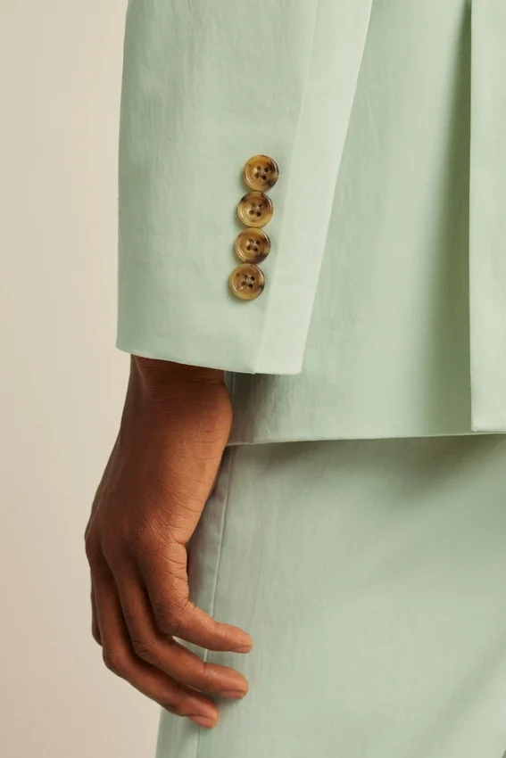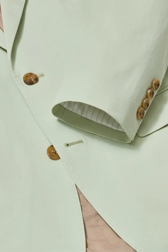 Jacket Features Peak Lapel | Patch Pockets | 2 Button Single Breasted | Unlined Interior with Binding at Seams | Interior Welt Pockets | Non Functional Buttons at Cuff | Double Vent | Light Construction