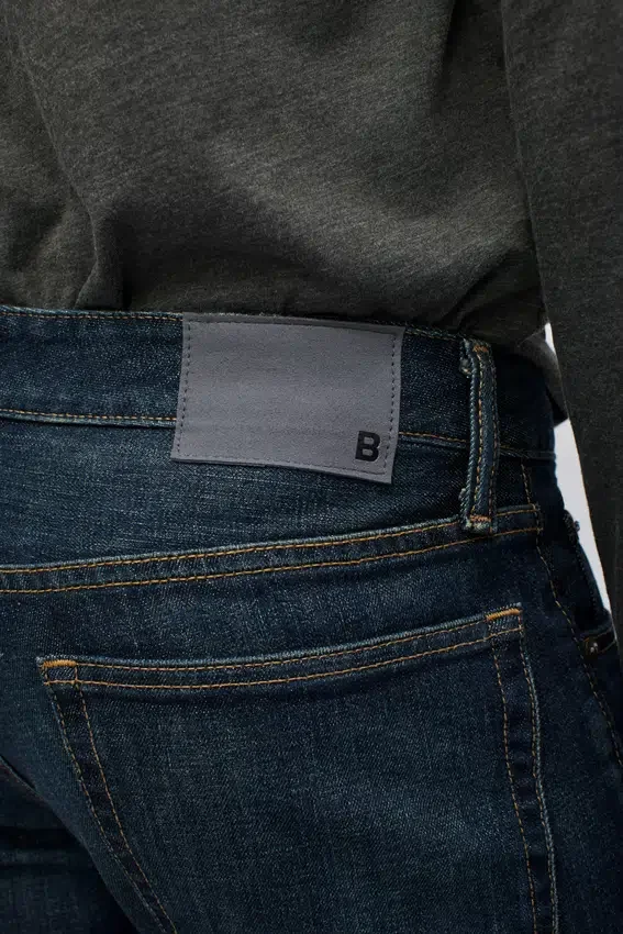 Signature Curved Waistband with 5 Pocket Denim Styling. Logo Antique Copper Center Front Shank. Single Distressed White Signature Rivet, Zip Fly, and Sailcloth Inspired Pocketing. Grey Faux Suede Patch at Back Waistband with B Logo.