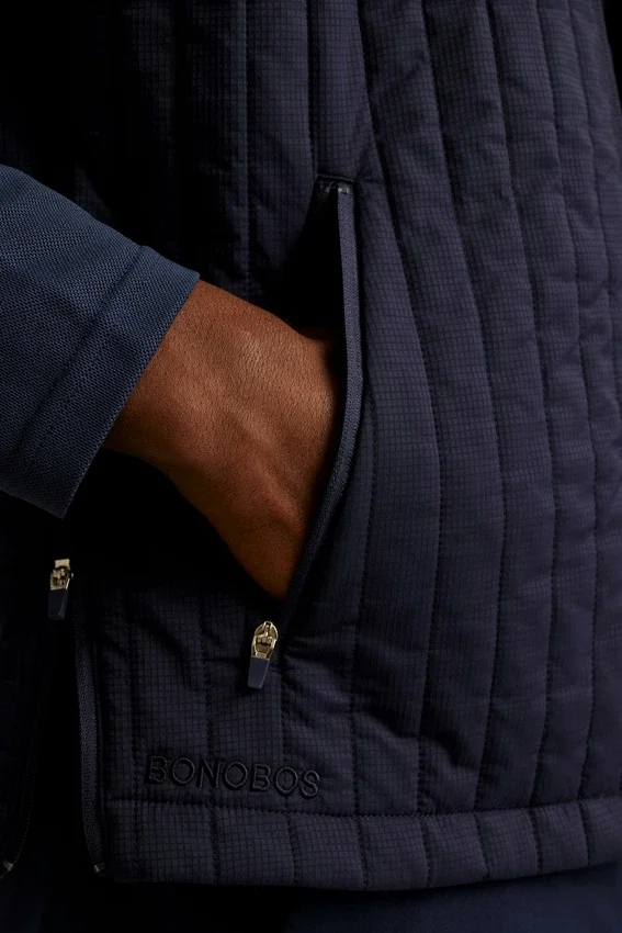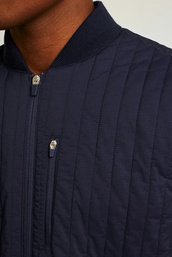 Water Resistant Finish | Nylon Stretch | Quilted Stitch with Medium Weight Fill | Side Seam Hem Zippers | Two Way Center Front Zipper | Grosgrain Back Neck Locker Loop | Chest and Hip Zippers for Golf Tees and Score Card