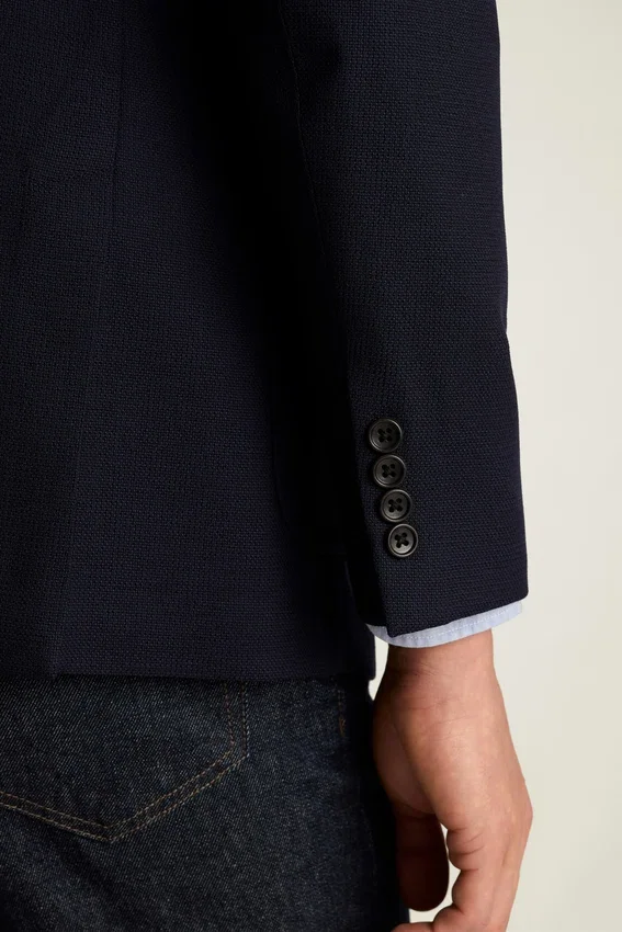 Lightly Constructed and Minimally Lined | Breathable Wool Hopsack from Italy’s Marzotto Mill | 3-1/4″ Lapel | Patch Pockets | Two-Button Single-Breasted | Unlined Interior with Shoulder Support and Binding at Seams | Sleeve Lining | Non-Functional Buttons at Cuffs | Double Vent | Interior Welt Pockets